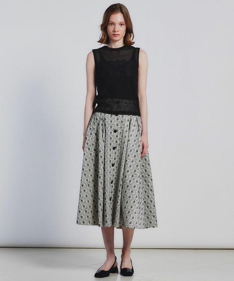 前身頃に透け感のある素材をドッキングした、涼しげなタンクトップ。胸元には繊細なレースをあしらい、フェミニンなアクセントを効かせました。モノトーンの配色で、コーディネートに取り入れやすい一方、甘くなりすぎず辛口に着られるのが魅力的。スカートに合わせると、コーディネートを大人っぽく引き締めてくれます。