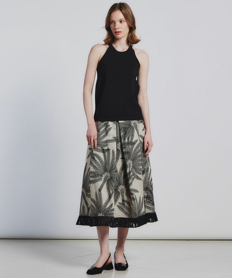 ヘルシーな印象を与えるアメリカンスリーブのタンクトップ。弾力性のある糸とヴィスコース糸を巻いて撚糸した素材を使用し、目面が美しく、シャリ感のある風合いに仕上げました。一枚でも、インナーでも着用できるため、真夏から肌寒い時期まで重宝する万能アイテム。同素材のカーディガン(型番:0309062243)とのアンサンブルもおすすめです。