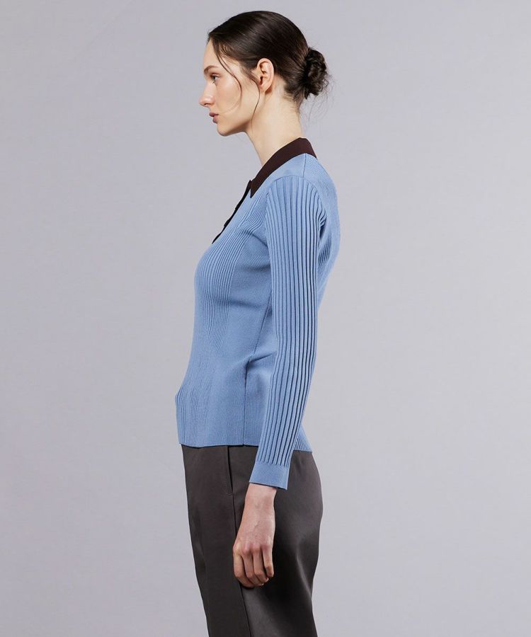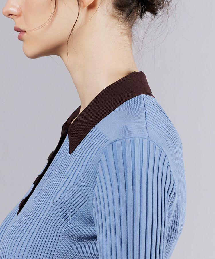 サックスブルーとダークブラウンのバイカラーが目を引く、レトロな雰囲気の長袖ポロニット。ドライな手ざわりで、さらりと快適な着心地を叶えました。縦のラインを強調するデザインで、すっきりとした印象に。タイトなシルエットはフレアスカートなど、ボリュームのあるボトムスとも好相性で、バランスの良い着こなしが楽しめます。