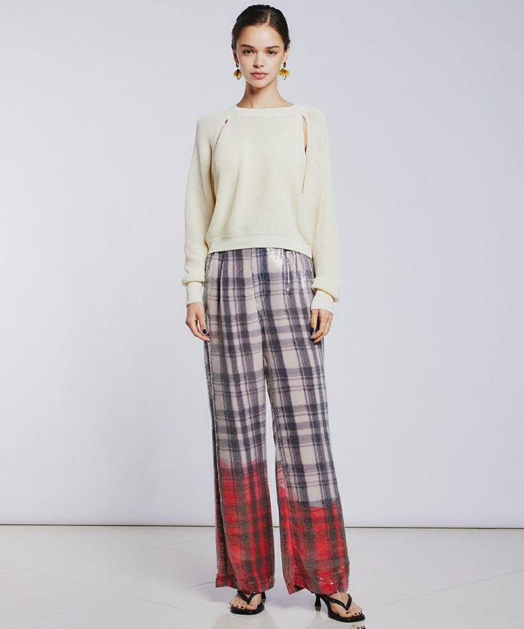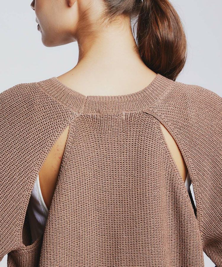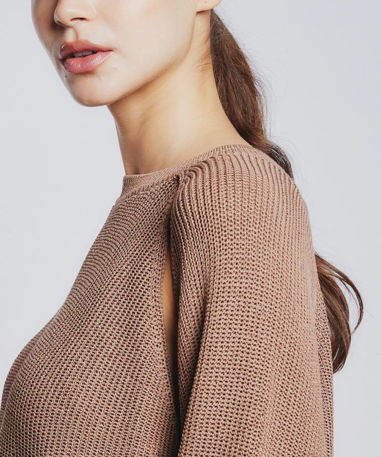 さらりとした14ゲージの方片畦編みをベースにしたニットトップス。一見ベーシックなニットトップスですが、前後のラグラン部分のリンキングを外し、カットラインをアクセントにしています。さりげない肌見せが叶うため、コーディネートしたときに大人っぽい抜け感が出るのが魅力。ショート丈なのでコーディネートのバランスを取りやすく、ハイウエストなアイテムとも相性抜群です。