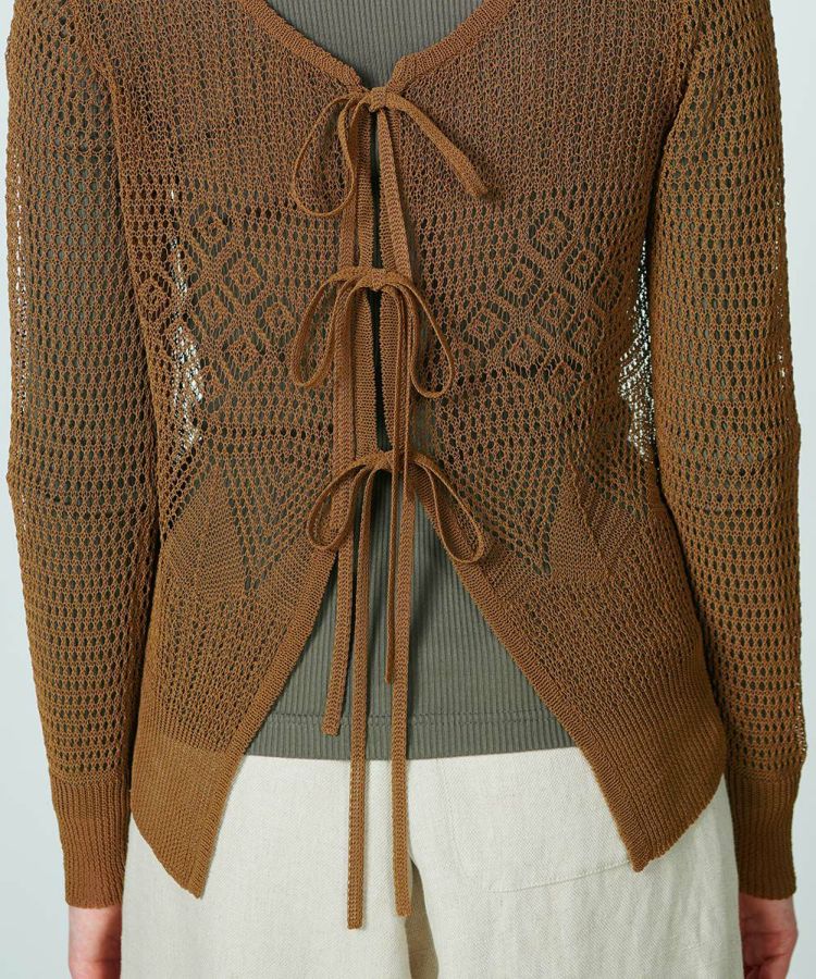 柔らかな素材感と繊細な編み模様がかわいらしい、透かし編みのニットトップス。タンクトップで肌見せしたり、配色のロングスリーブをコーディネートしたりと、インナーとの合わせが楽しみになるアイテムです。前後どちらでも着用できるのもうれしいポイント。リボンのデザインが、どんなコーデにもフェミニンな印象をプラスしてくれます。