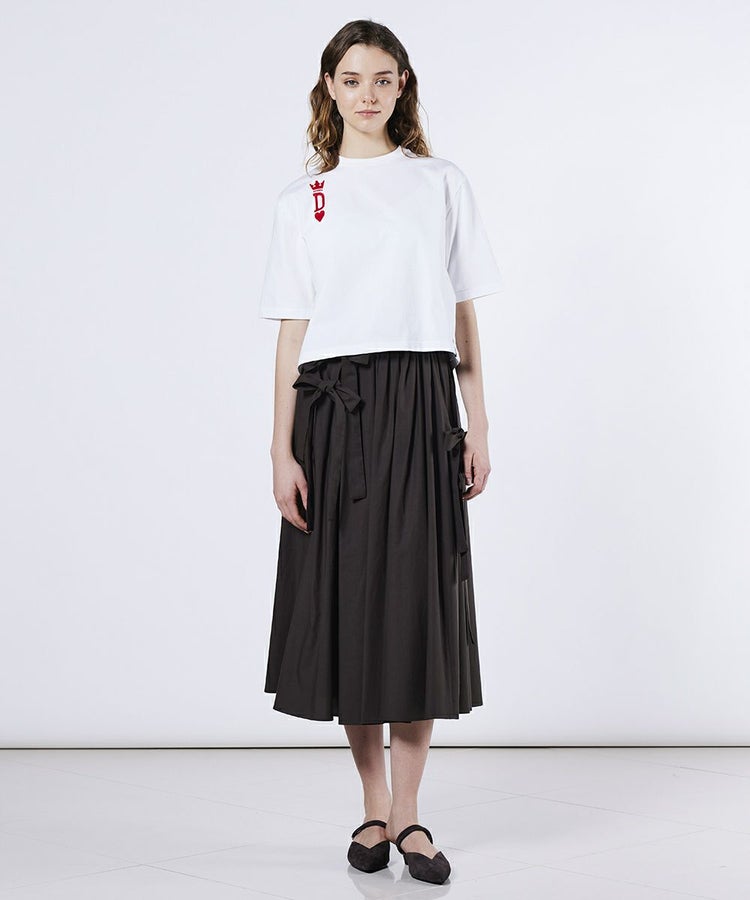 程よくハリ感のある生地がカジュアルすぎず、きれいめな着こなしを叶えるTシャツ。胸元の遊び心あるトランプモチーフは京都の刺繍工場でチェーンステッチに仕上げ、繊細なディテールが上品な存在感を放ちます。シルエットはゆったりめなので、大人の抜け感を演出。デイリー使いに活躍する一枚です。