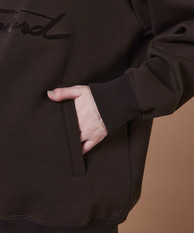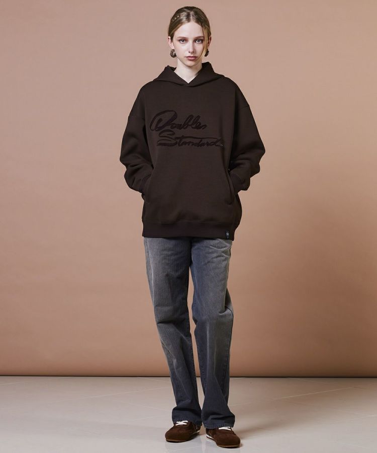 ダブスタロゴをハブラシのような立体感のある刺繍で表現したパーカー。刺繍とボディを同系色でまとめることで、さりげない存在感と上品さを両立させました。動きやすく保温性にも優れたダンボール素材を使用しており、肌寒い季節にぴったりの一枚。柔らかな印象のブラウンとベージュのカラー展開で、大人かわいいカジュアルスタイルを楽しめます。