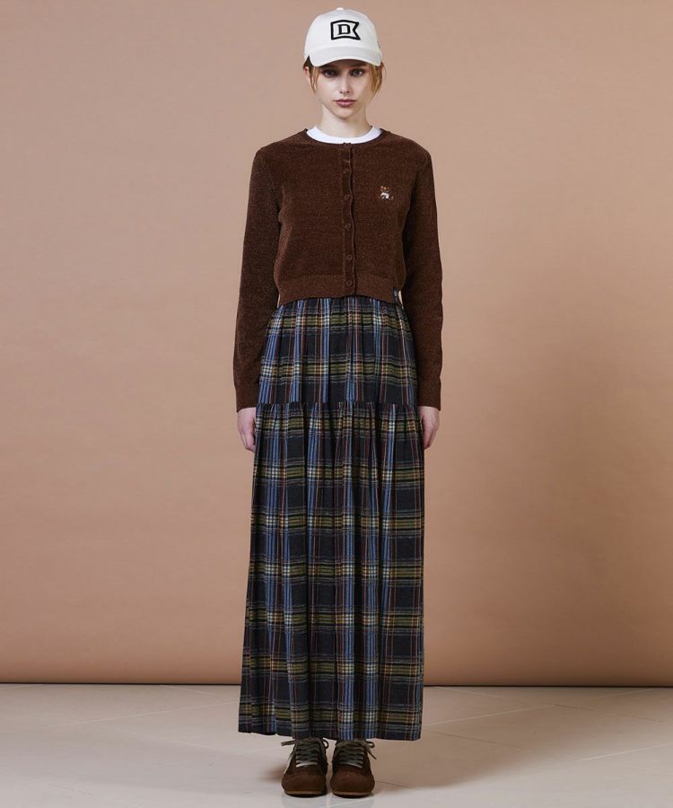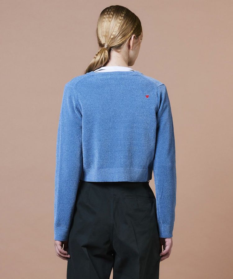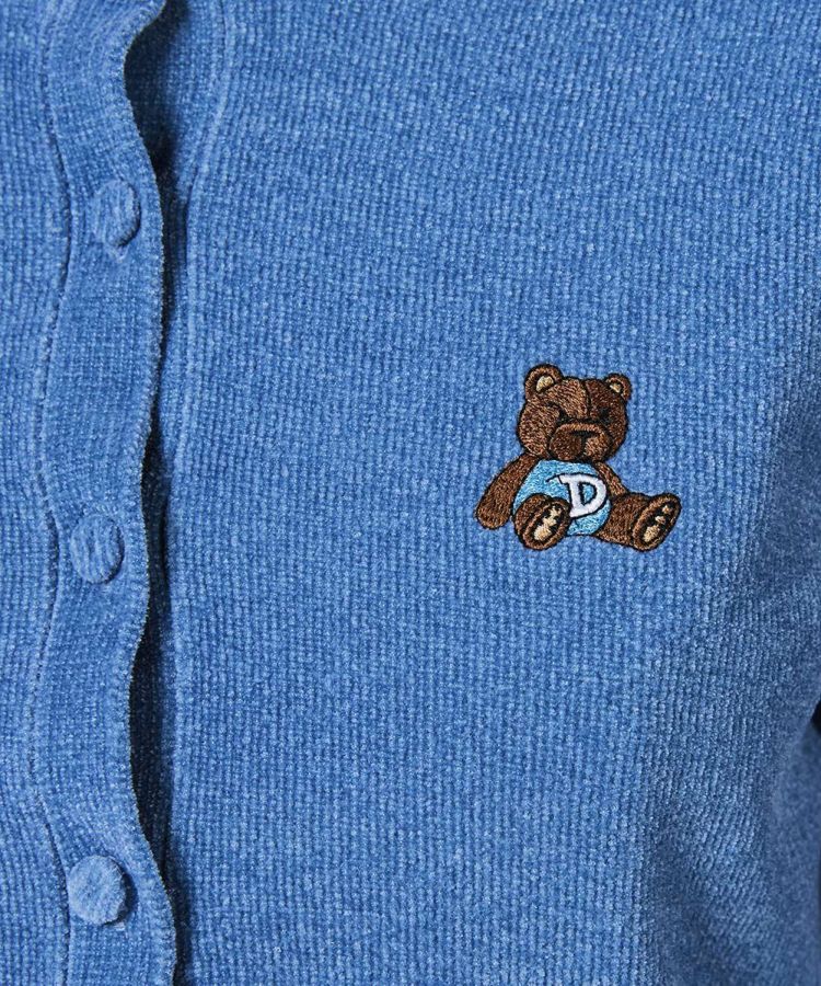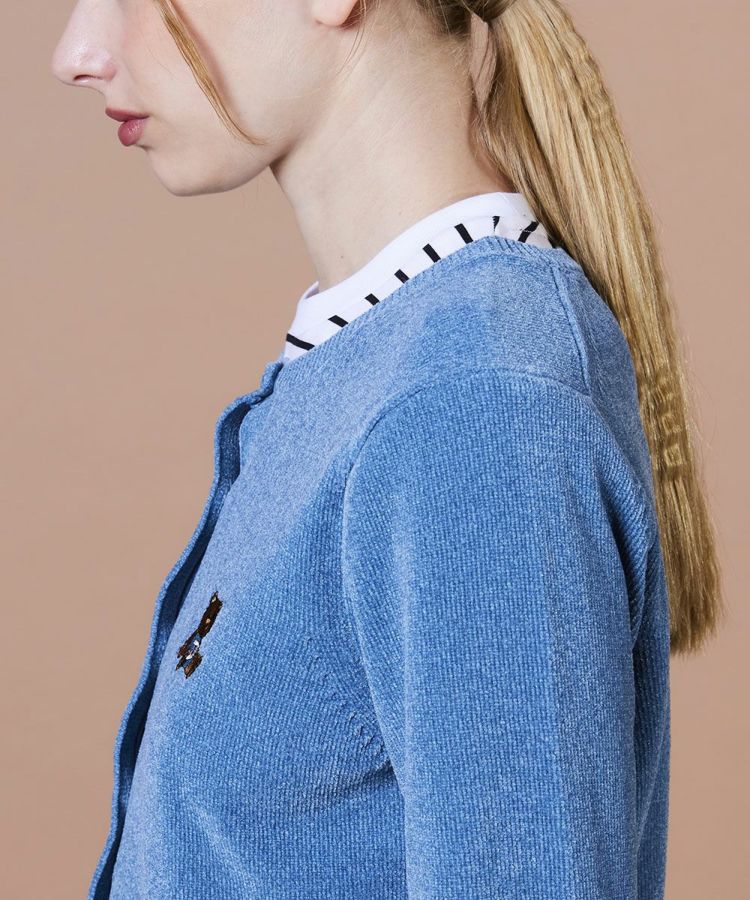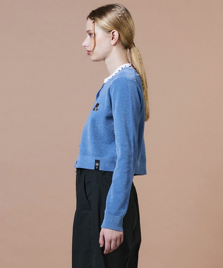 胸元にあしらったクマの刺繍が、さりげないポイントになったカーディガン。ポリエステル100%のモール糸を使用し、上品な光沢とふっくらとした立体感が魅力です。ノーカラーデザインで首元がすっきりと見えるのも好ポイント。ショート丈でボトムスとのバランスも取りやすく、幅広いスタイリングにマッチします。