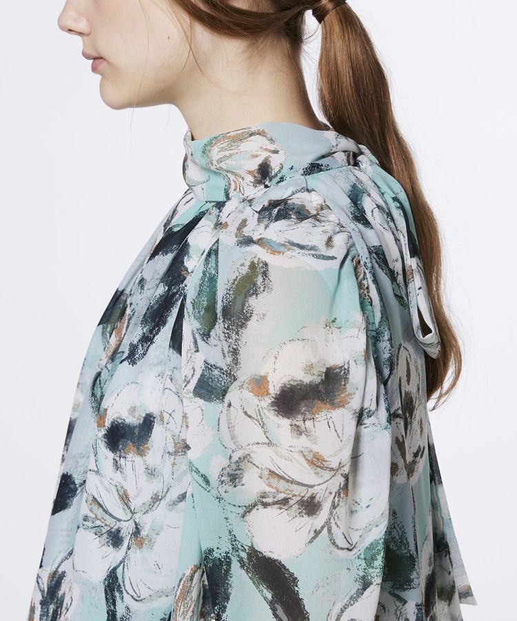 エレガントなフラワープリントが印象的なブラウス。胸元に施した繊細なギャザーが華やかさを引き立て、女性らしい柔らかな表情を演出します。ボリュームのあるボウタイリボンは、フロントでもバックでも結べる2WAY仕様で、気分やシーンに合わせた着こなしを楽しめるのも魅力。ロングスカートやスラックスとも好相性で、ブラックのボトムスを合わせれば上品でメリハリのあるスタイルが完成します。