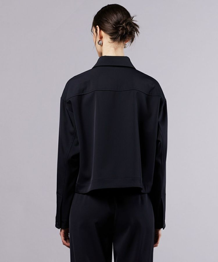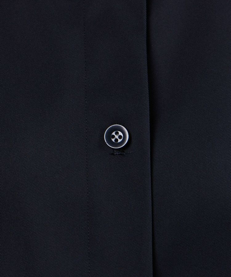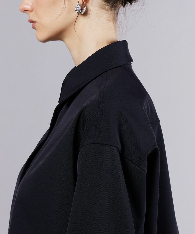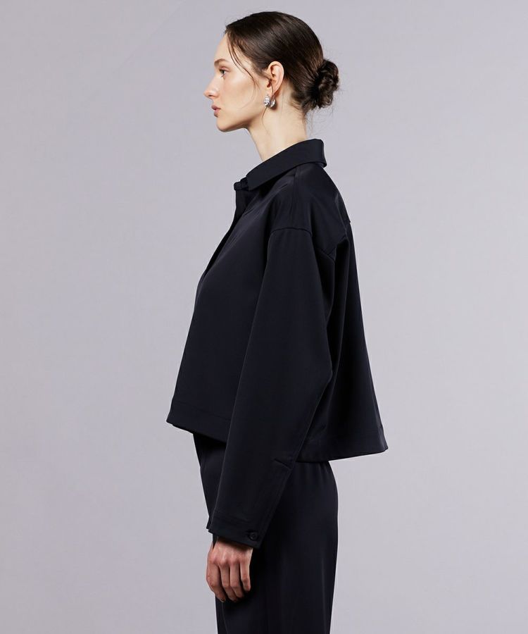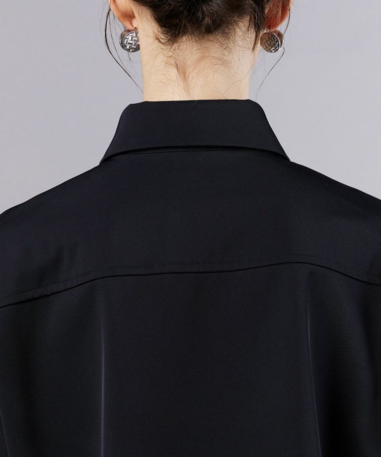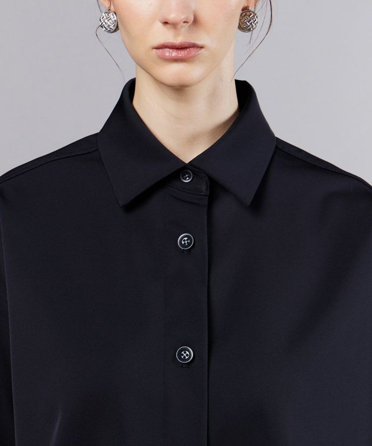 奥行きのあるダークネイビーのカラーリングが特徴的なツイルシャツ。ナチュラルなストレッチ感とソフトな風合いを兼ね備えたリサイクルポリエステル素材を使用しスタイリッシュなシルエットに仕上げました。ショート丈でどんなボトムスともバランス良く着こなせるのが高ポイント。同系色のボトムスと合わせれば、モードな装いが完成します。