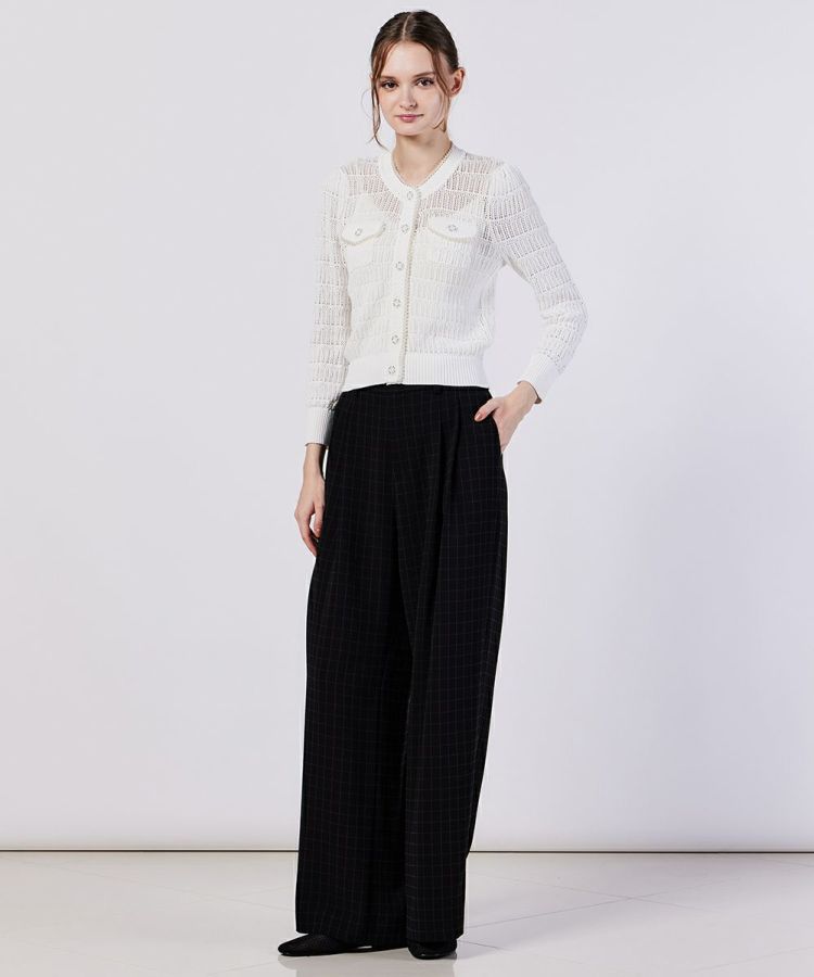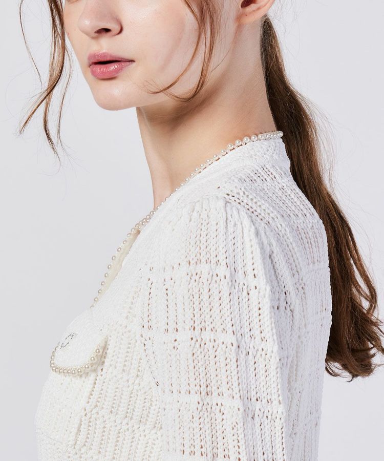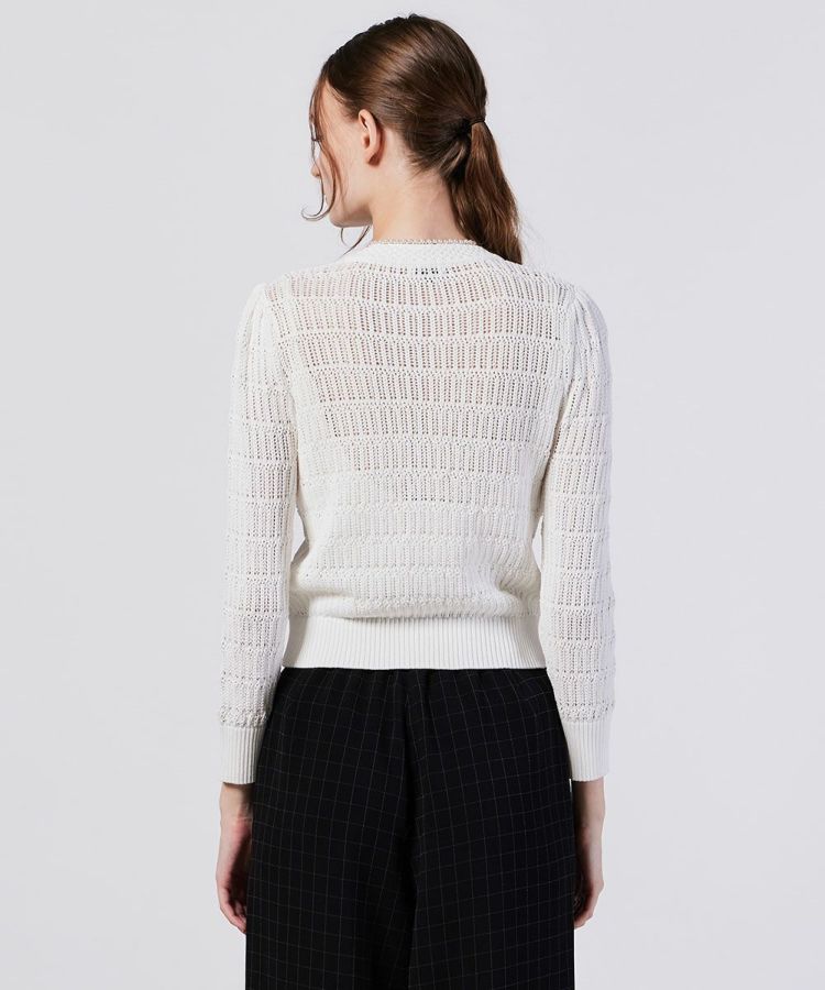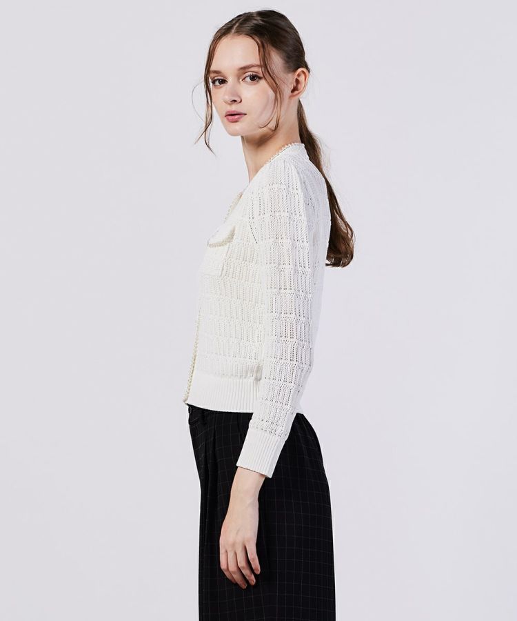 透かし編みが涼しげなカーディガン。段々になった編み模様が、コーディネートにさりげない華やかさをプラスしてくれます。また、胸元のポケットやオリジナルのボタンがカジュアルなアクセントに。コンパクトなシルエットなのでボトムとのバランスを取りやすく、スタイルアップ効果も抜群です。