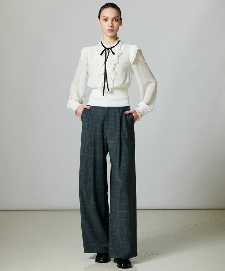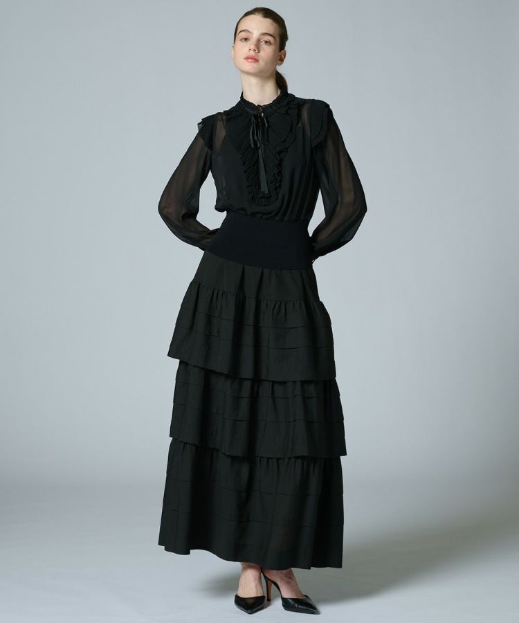 シアー感のある生地にたっぷりとあしらったフリルが、フェミニンな印象を引き立てるブラウス。ゆったりと優雅に広がるスリーブに対し、ウエストをタイトに仕上げることで、シルエットにメリハリをプラスしました。上半身を華奢に見せる効果があり、スタイルアップも叶う一枚。パンツを合わせればモードに、スカートと合わせれば上品にと、幅広いスタイリングを楽しめます。