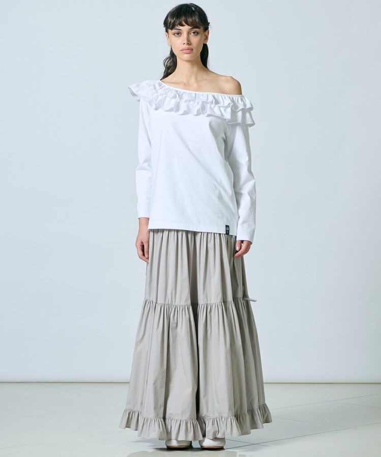 オフショルダーで女性らしいムードを演出できるトップス。体型をさりげなくカバーでき、ロンT感覚で着られるオーバーサイズなシルエットがポイントです。フリルのディテールながらも、コットン素材なので甘さは控えめ。スカートはもちろん、パンツにラフに合わせても大人かわいくキマる一枚です。裾のブランドタグがさりげないアクセントになっているので、アウトして着るのもおすすめ。