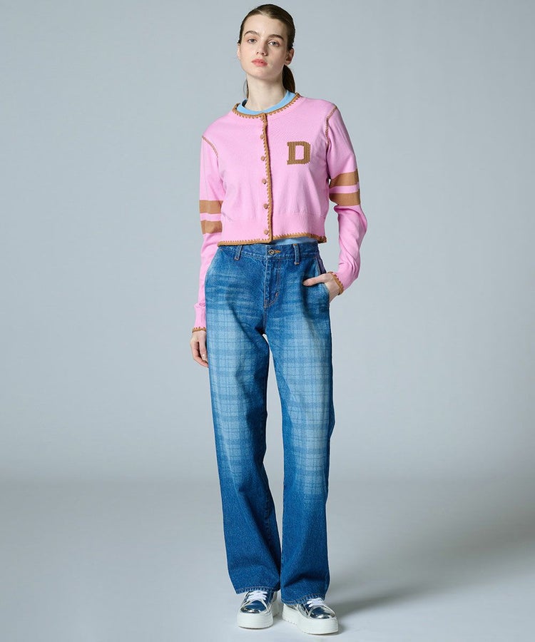 スクールライクな雰囲気のカーディガン。胸元に配した“D”のモチーフと、袖のラインがさりげないデザインアクセントになっています。ピンクとキャメルのカラーリングがガーリーな印象に。デニムはもちろん、同系色のパンツとも好相性で、幅広いスタイリングに活躍します。