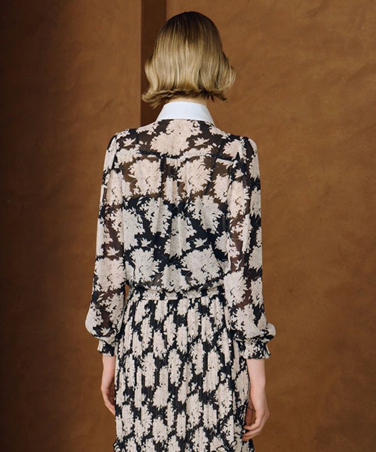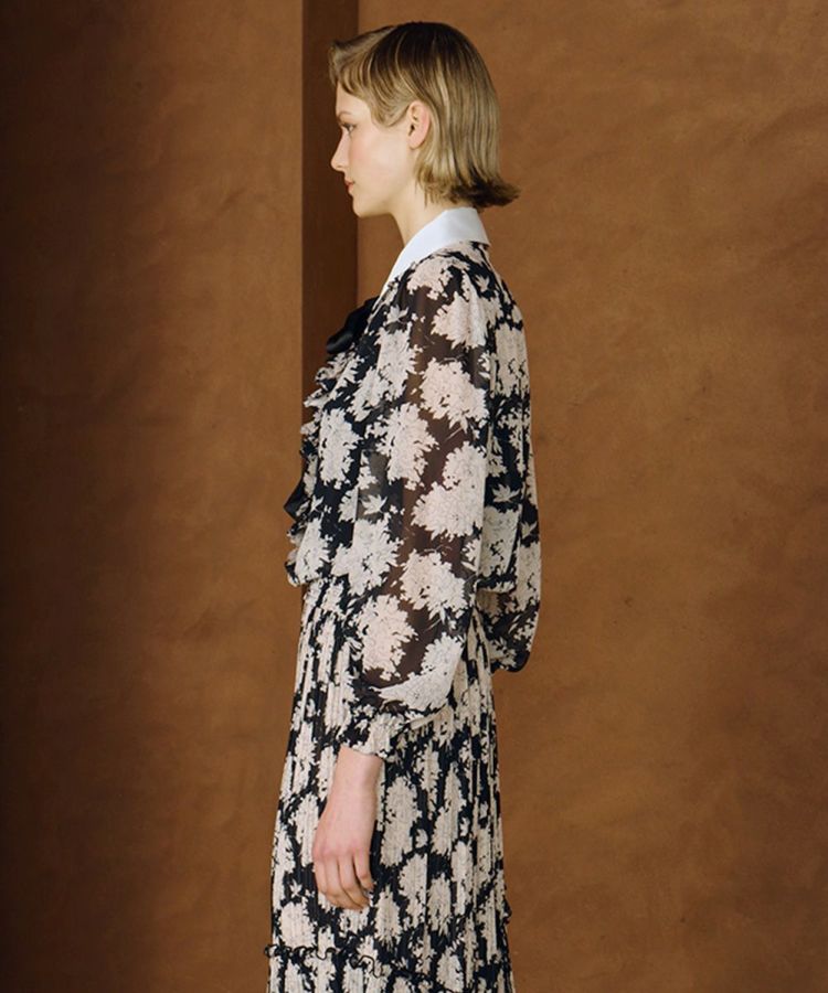 柔らかなシフォン素材が女性らしさを引き立てるブラウス。シックなカラーリングで、エレガントな雰囲気を演出してくれます。首元の大きめリボンがエッジの効いたアクセントとなり、甘すぎない“大人可愛い”スタイルに。同素材のスカート(型番:3802081253)と合わせてワンピースっぽく着用するのもおすすめです。