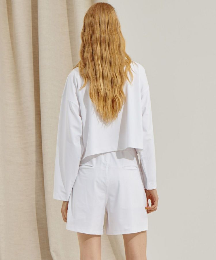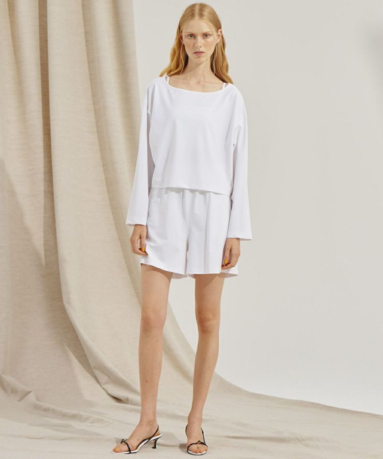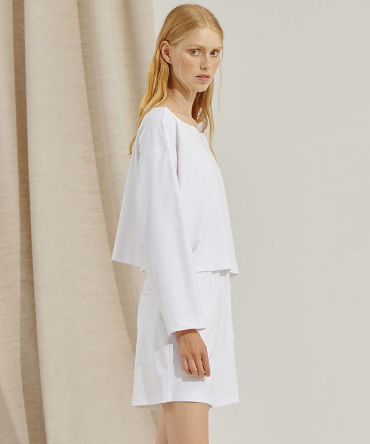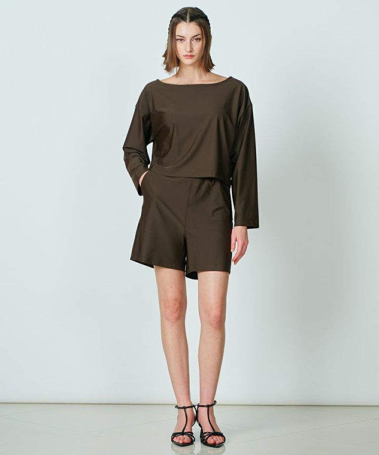 ゆとりのあるシルエットのラッシュガードトップス。鎖骨に沿ってゆるやかな曲線を描く、ボートネックがデコルテラインをきれいに見せてくれます。ベーシックなデザインなので、Tシャツ感覚で着まわしやすく、どんなスイムウェアにもぴったり。同素材のショートパンツを組み合わせると、よりラフな雰囲気に。カラーを統一すればオールインワンのように着こなせます。