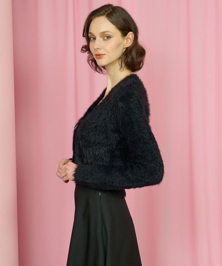 毛足の長いフェイクファーが華やかで存在感を放つカーディガン。羽織るだけでスタイリングをクラスアップしてくれる主役級アイテムです。フロントにはビジューをあしらったボタンを採用し、エレガントなきらめきをプラス。フェミニンな雰囲気を引き立てるホワイトと、シックで大人っぽいブラックの2色展開でご用意しています。