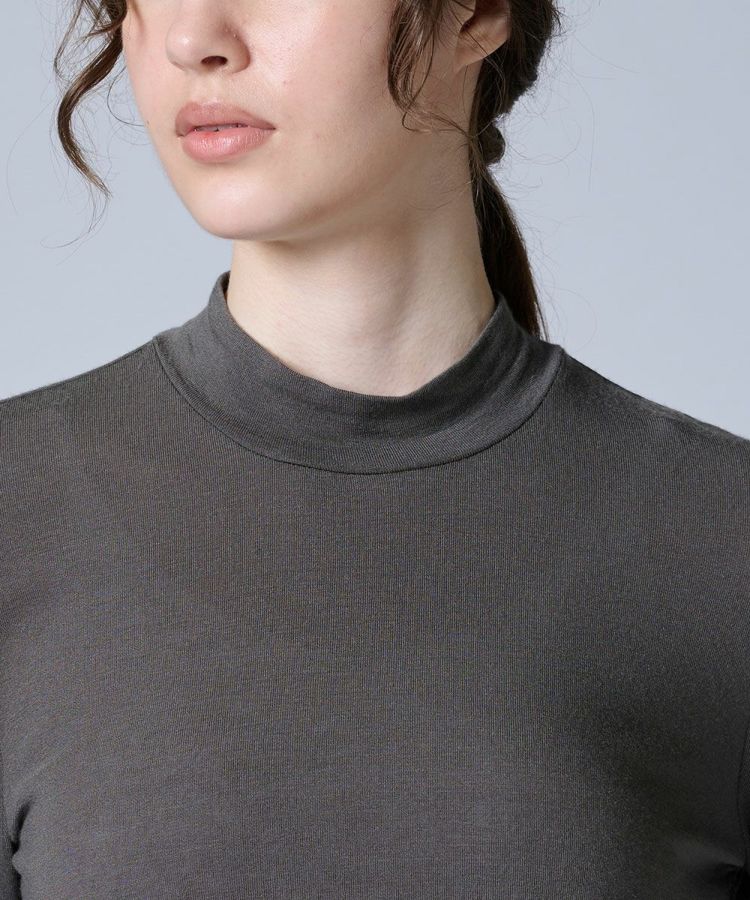 肌触りがなめらかで、心地よい伸縮性を備えたベア天竺素材を使用したカットソー。軽やかなシアー感のある生地は、ほんのりと肌を透かし、女性らしいセンシュアルな雰囲気を演出してくれます。ハイネック仕様なのでジャケットやカーディガンのインナーとしてはもちろん、ワンピースのレイヤードにもおすすめ。1枚でさらっと着れば、抜け感のあるスタイリングが完成し、トレンド感のある今っぽい着こなしを楽しめます。