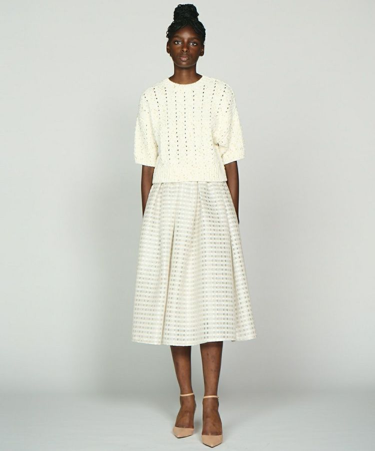 テープ糸とラメ糸など、4種類の異なる糸をMIXして編み込んだニットトップス。透け感のある編み地やゆったりとしたシルエットがリラクシンで、五分袖が二の腕をさりげなくカバーしながら、こなれた雰囲気を演出してくれます。ナチュラルながらも着映えするので、デニムに合わせるだけでもサマになるのが魅力的。スカートに合わせて柔らかな印象を楽しむのもおすすめです。