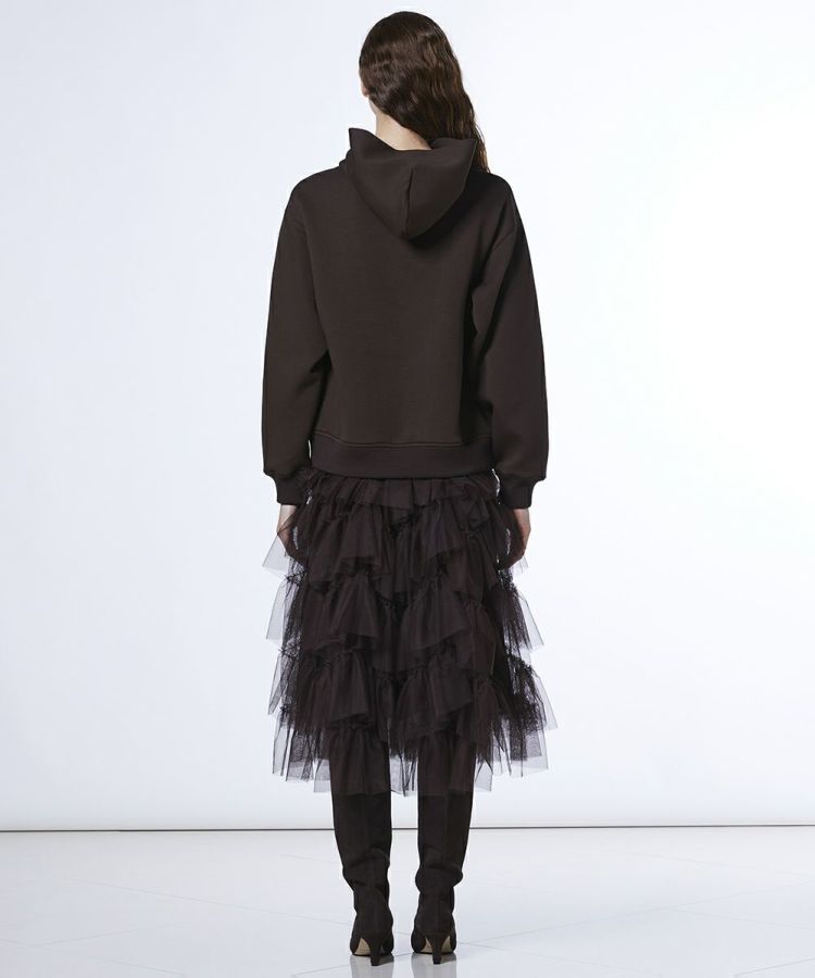 1枚でコーディネートが完成するドッキングワンピース。カジュアルなフーディーに、ふんわりと広がるフェミニンなチュールスカートを組み合わせ、甘辛バランスの効いたデザインに仕上げました。ティアード調のスカートが動くたびに揺れ、脚をすっきりと見せてくれるのも嬉しいポイント。足元は同系色のブーツを合わせれば、統一感のあるスタイリングが楽しめます。