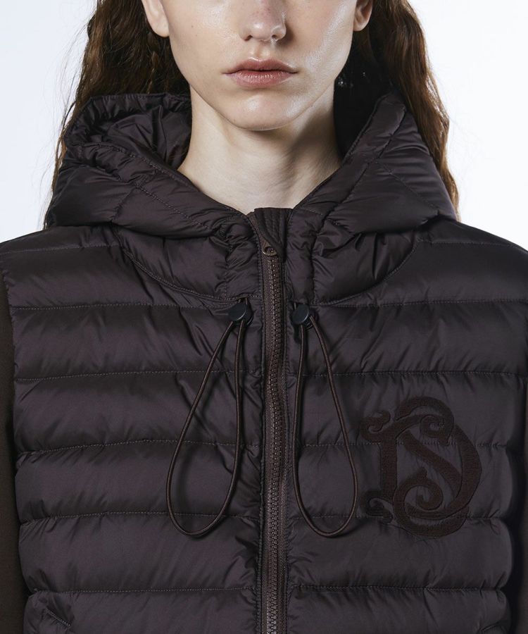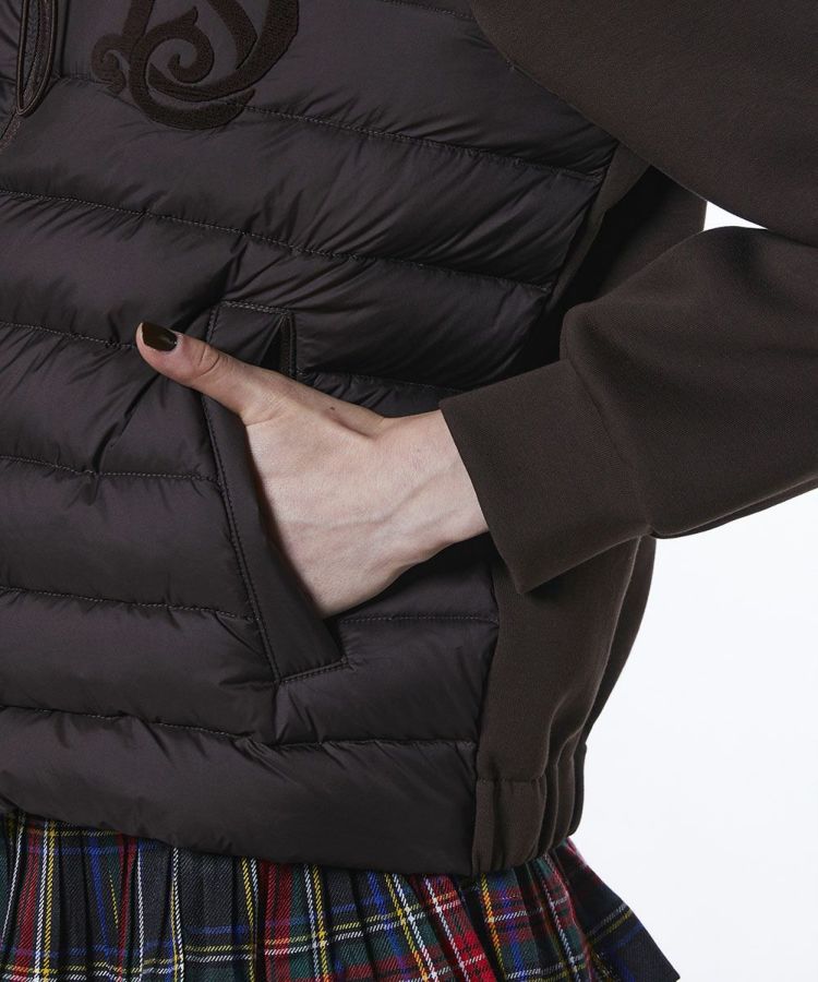 ダンボールニットとタフタ素材をドッキングさせたブルゾン。胸元にはダブスタのロゴデザインを立体感のあるブラシ刺繍で施し、さりげないアクセントを添えました。保温性にも優れているので、肌寒い季節に活躍すること間違いなし。ロングシーズンで使える優秀なアイテムです。