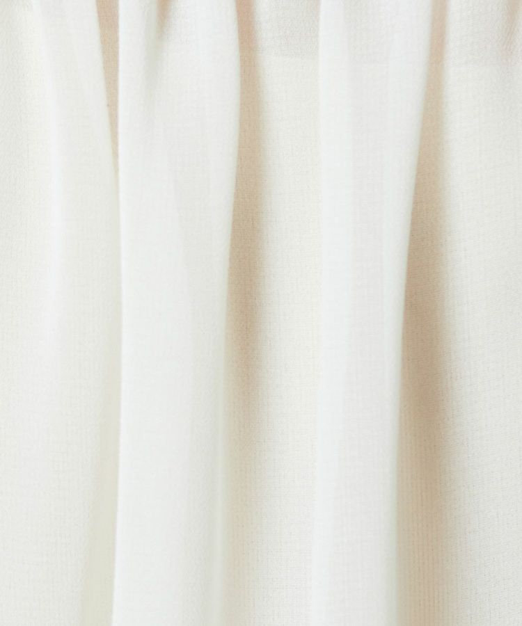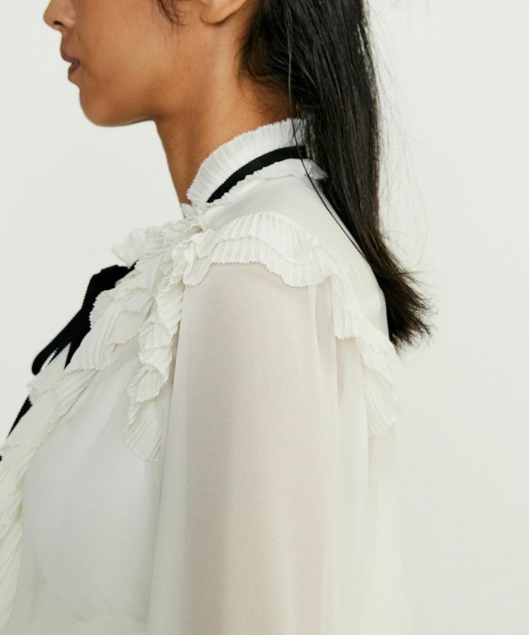 シアー感のある生地にたっぷりとあしらったフリルが、フェミニンな印象を引き立てるブラウス。ゆったりと優雅に広がるスリーブに対し、ウエストをタイトに仕上げることで、シルエットにメリハリをプラスしました。上半身を華奢に見せる効果があり、スタイルアップも叶う一枚。パンツを合わせればモードに、スカートと合わせれば上品にと、幅広いスタイリングを楽しめます。