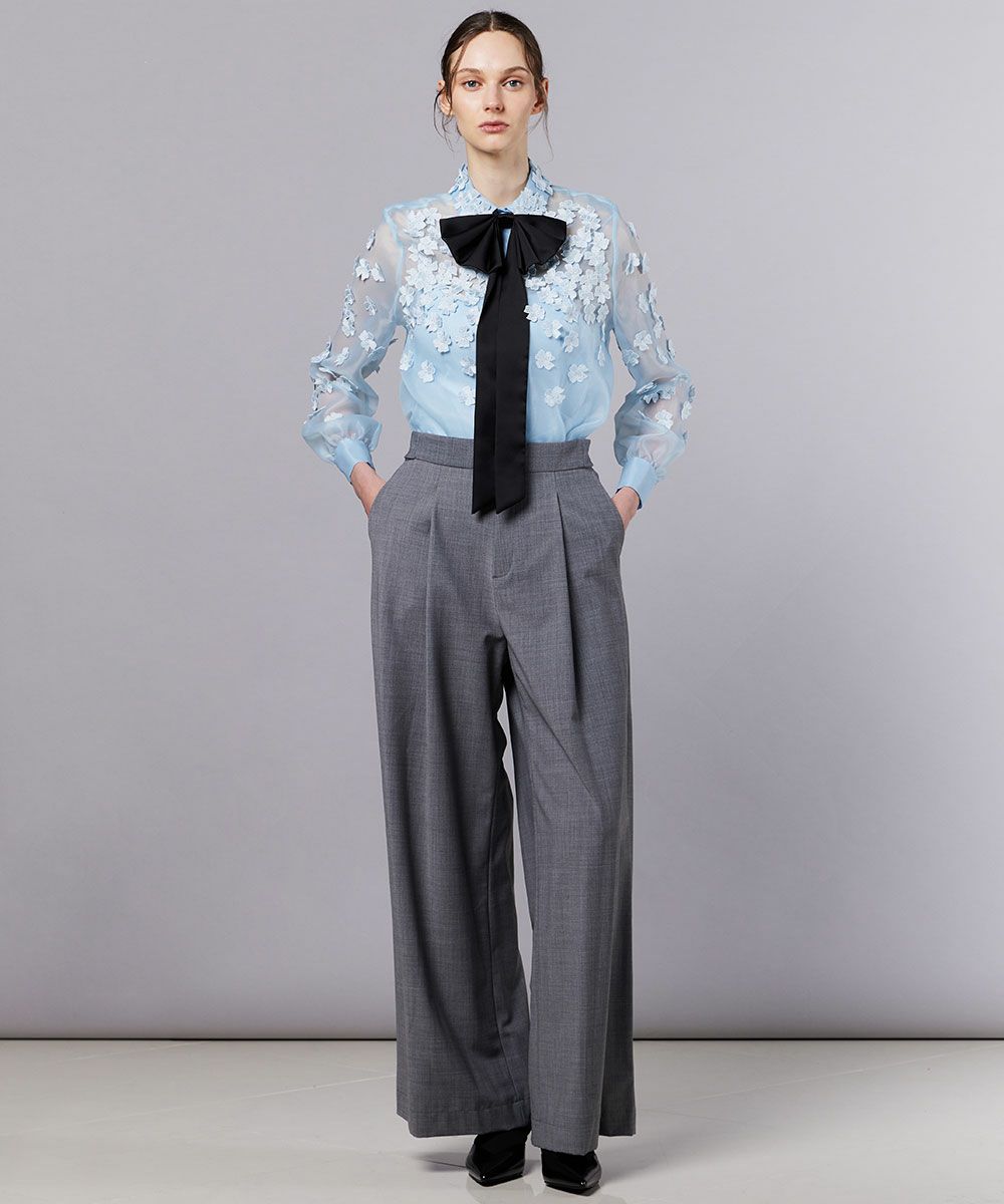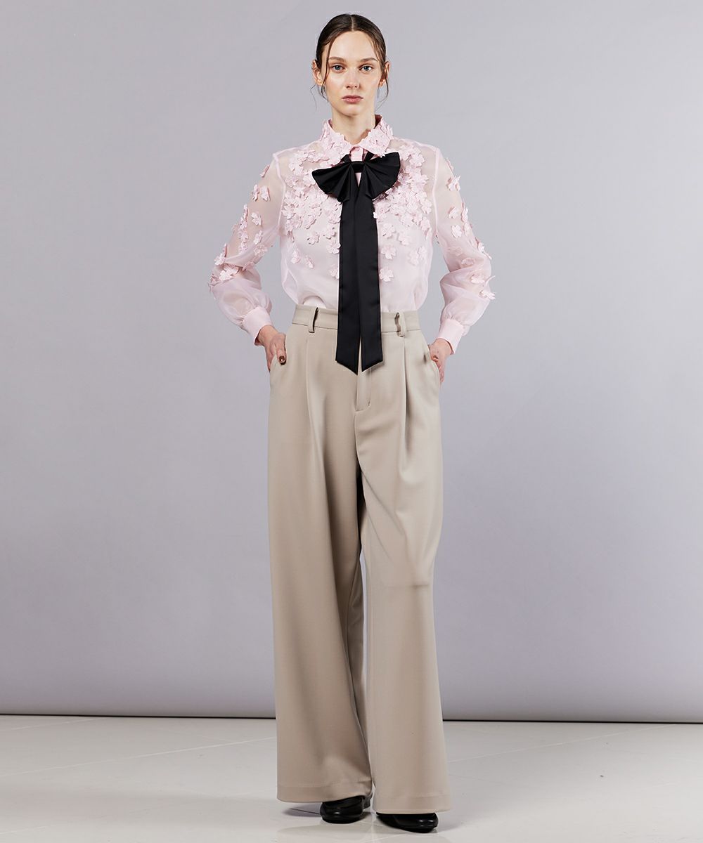 上品な透け感がフェミニンな印象を与えるオーガンジーのブラウス。立体的なフラワーモチーフを全面に散りばめ、華やかさプラスしました。胸元にあしらった大ぶりのボウタイリボンがデザインのアクセントに。カラーは使い勝手の良いオフと女性らしいピンク、WEB限定カラーのサックスの3色展開でご用意しました。