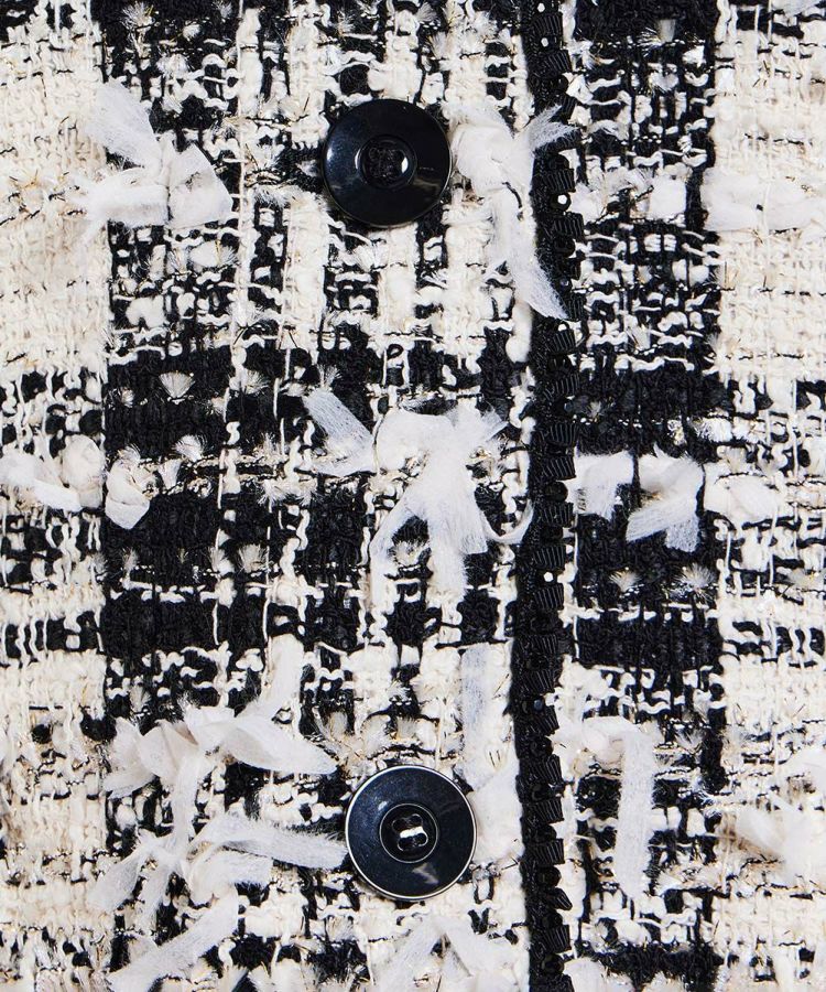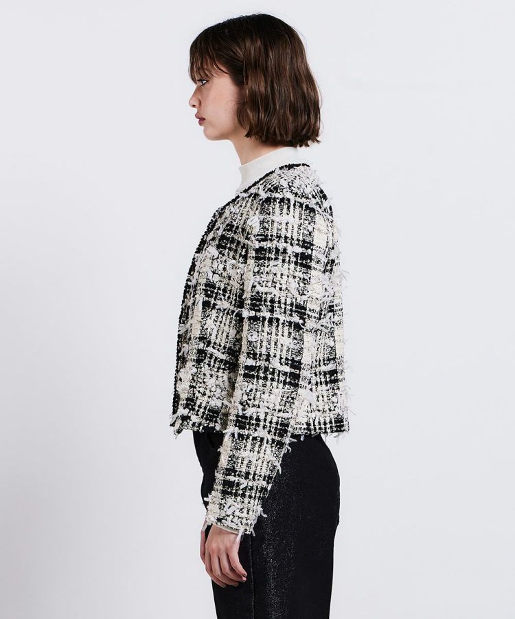 最高級ツイードに、細やかなテクニックを盛り込んだ唯一無二のジャケット。ハイブランドのツイードも手がける、フランスのファブリックメーカー、CLARENSON社のファンシーツイードを使用しています。独特のカラーリングは、インポートらしい華やかさ。特殊なビーズリボンも、リッチ感があります。ノーカラーなので、デニムなどにさっと合わせてこなれ感を出すのもおすすめです。