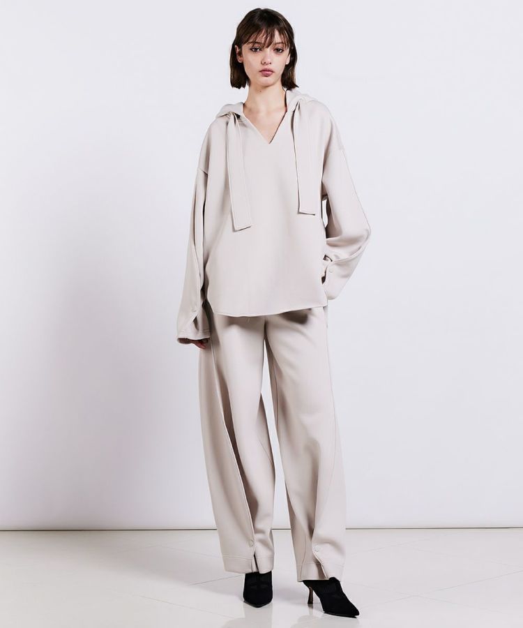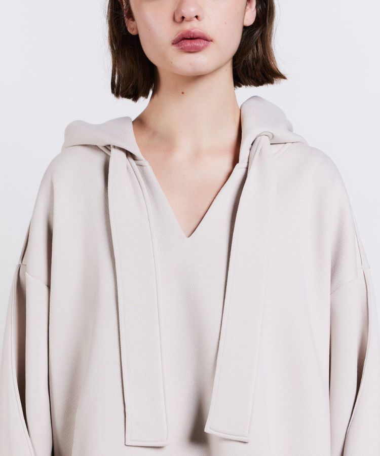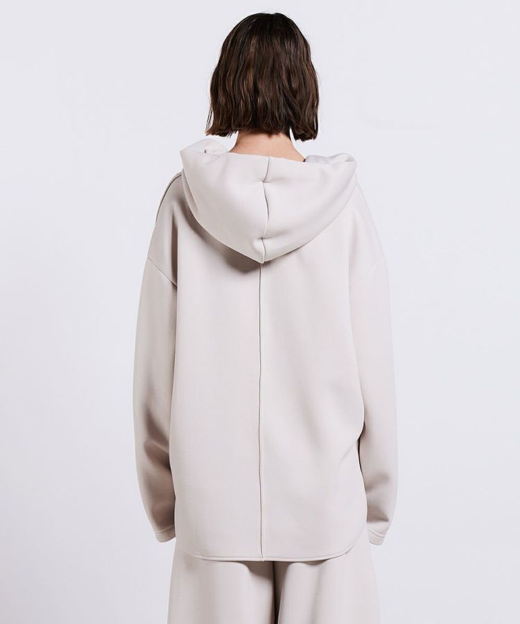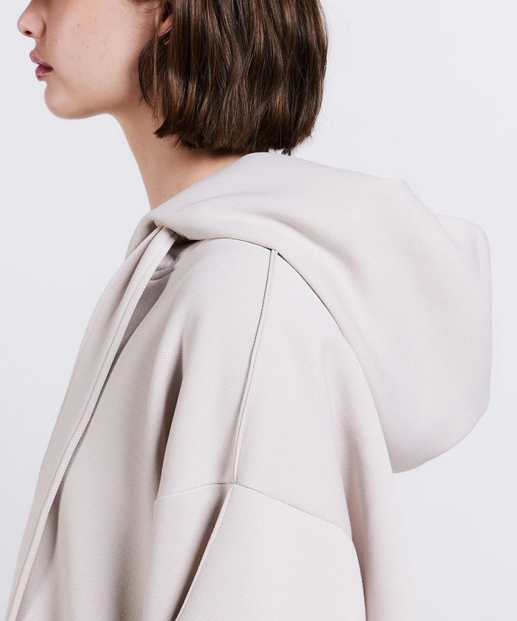 独特の膨らみ感となめらかな表面感が特徴の、ダンボールニットを使用したパーカー。布帛(ふはく)のようなしっかりとしたツイル目の組織感も特徴になっています。また、ダンボール素材でありながらとろみと落ち感があり、エレガント。立体感を出したデザインもユニークで、シンプルながらも、シルエットと質感で着映えが叶うアイテムです。同素材のパンツ(型番:0306111244)とセットアップで着用するのもおすすめ!