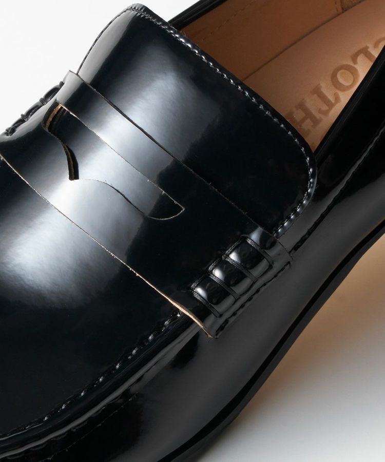 マニッシュな印象を与えるローファーに、ヒールをプラス。トゥは甲を薄く仕上げることでゴツくなりすぎず、デザイン性がありながらも女性らしく履けるのがポイントです。表面はエナメルではなくガラス調の素材を使用しているため、マットで高級感が漂う一足。ヒールで足長効果も狙えるため、すっきりとスタイリッシュなコーディネートを叶えてくれます。
